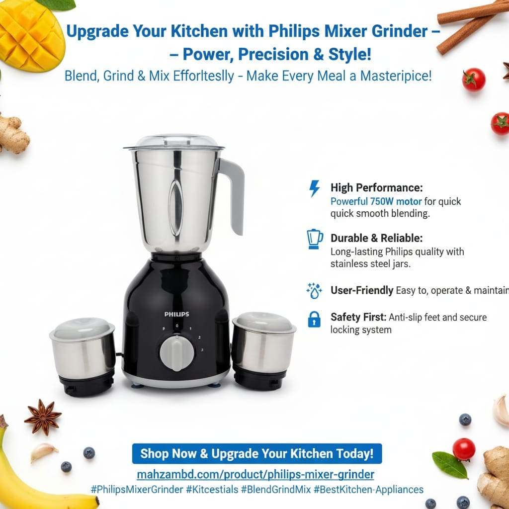 রান্নাঘরের সব কাজ এখন আরও দ্রুত ও মসৃণ! 💨 Philips-এর 750W শক্তিশালী মোটর, স্টেইনলেস স্টিল জার, এবং লিক-প্রুফ ডিজাইন আপনার প্রতিদিনের কিচেন টাস্ককে করে তুলবে সহজ ও প্রফেশনাল। 🇧🇩